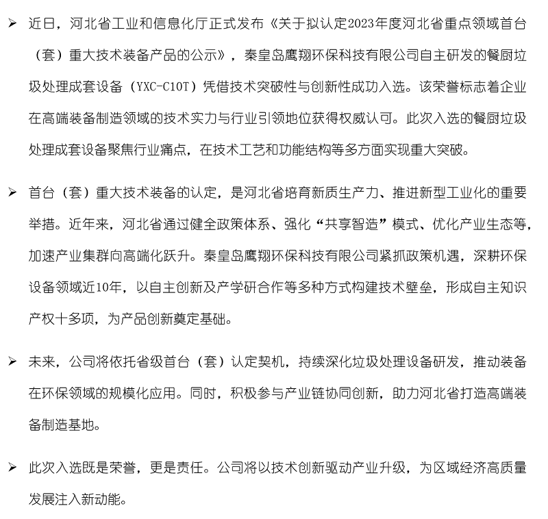 祝賀秦皇島鷹翔環(huán)保科技有限公司產(chǎn)品入選2023年度河北省重點(diǎn)領(lǐng)域首臺(套)重大技術(shù)裝備產(chǎn)品?